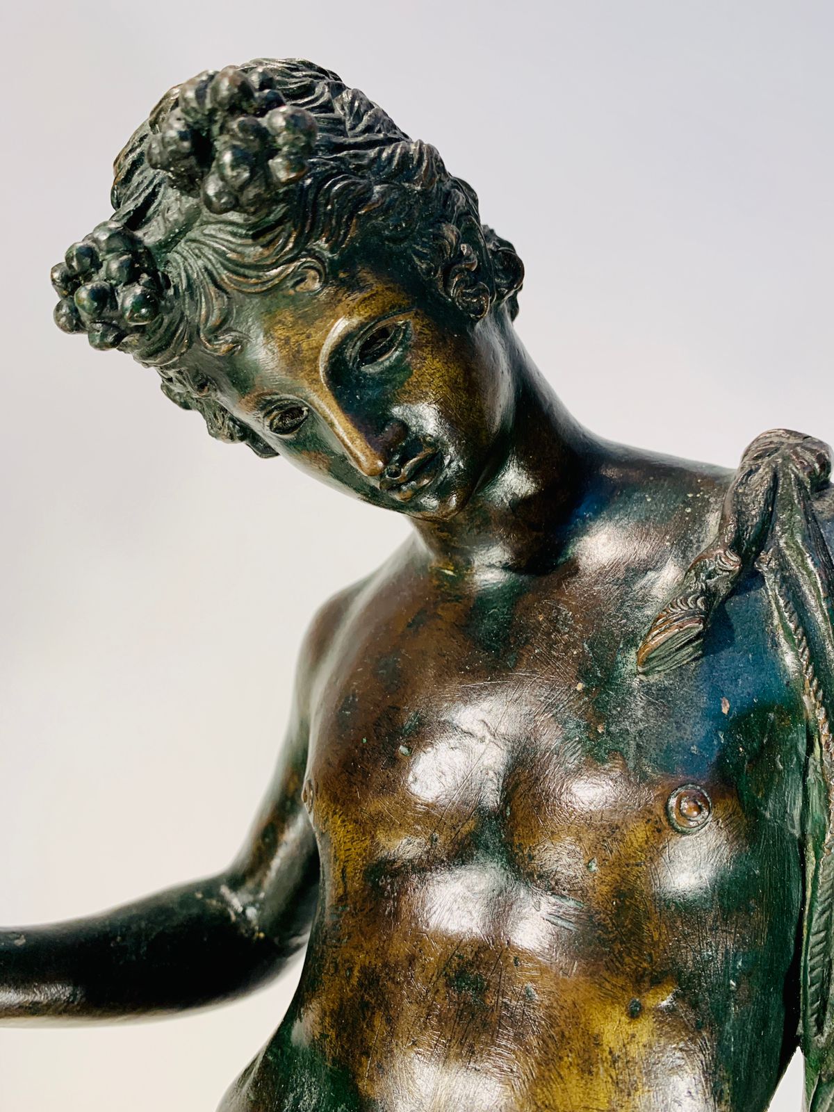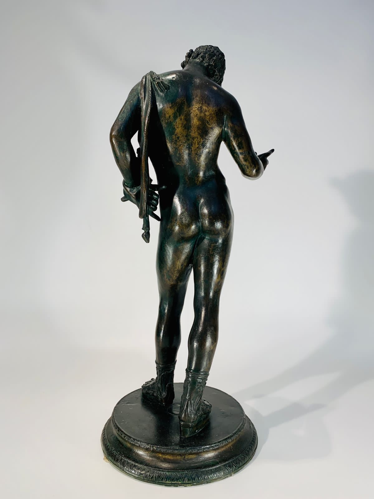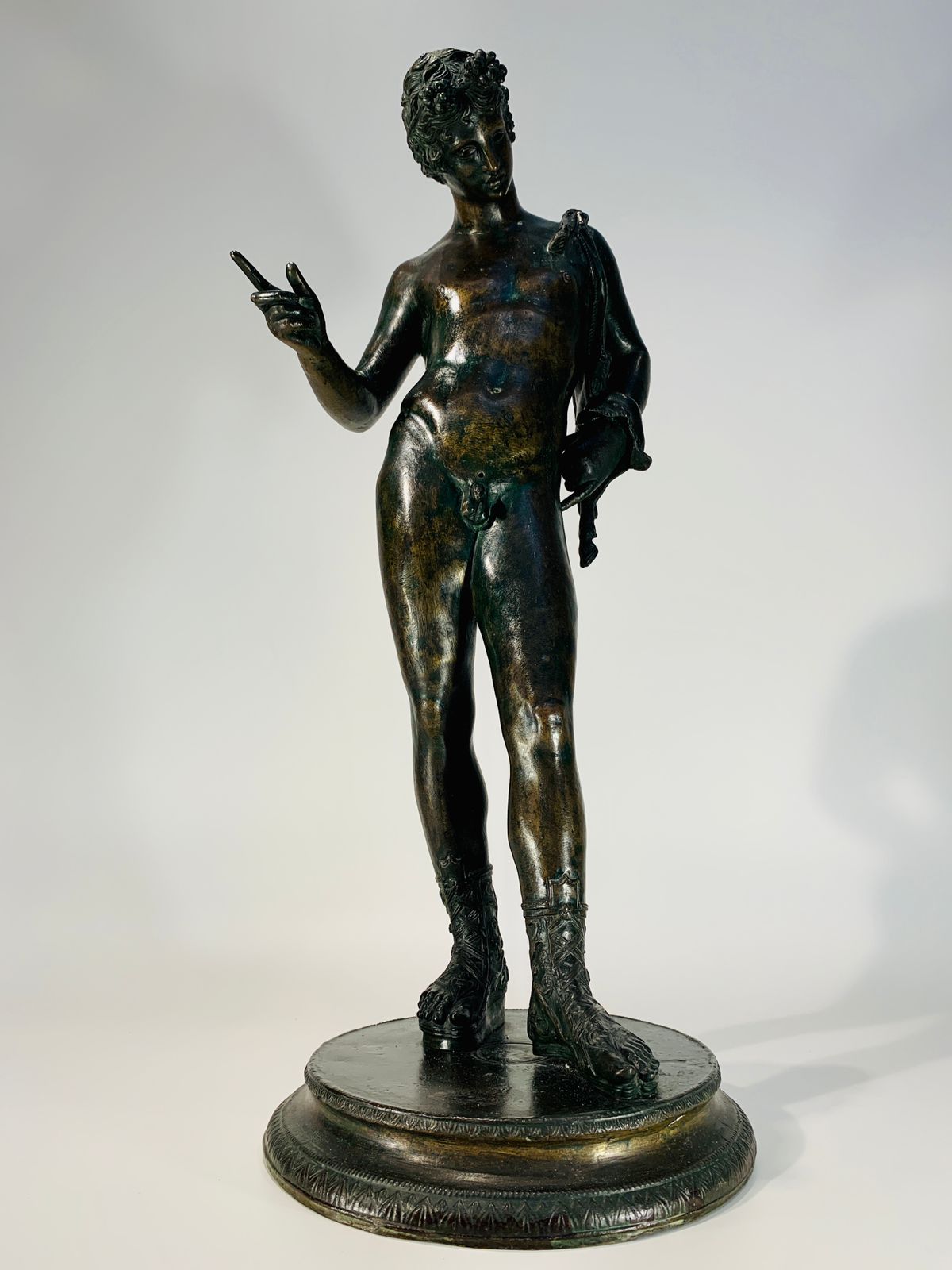 Bronze Romano representando “Narciso” com coroa de louros e pele de animal.