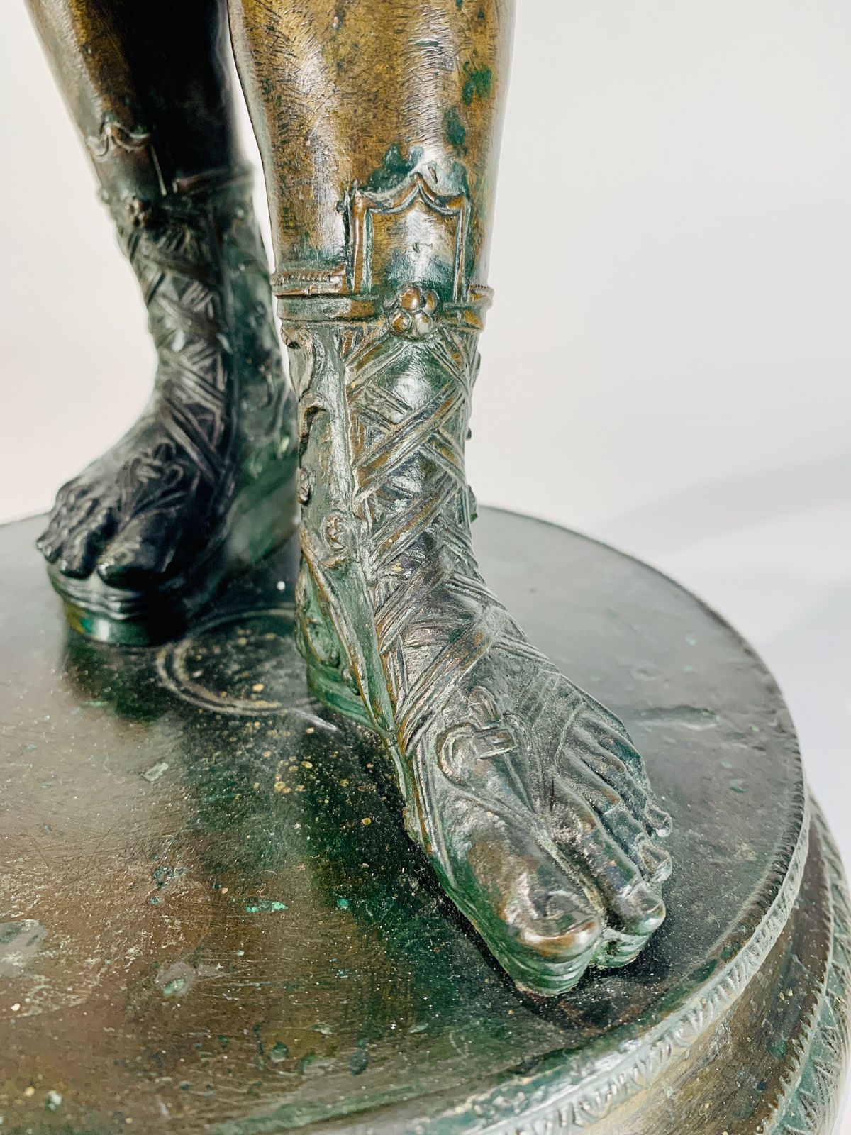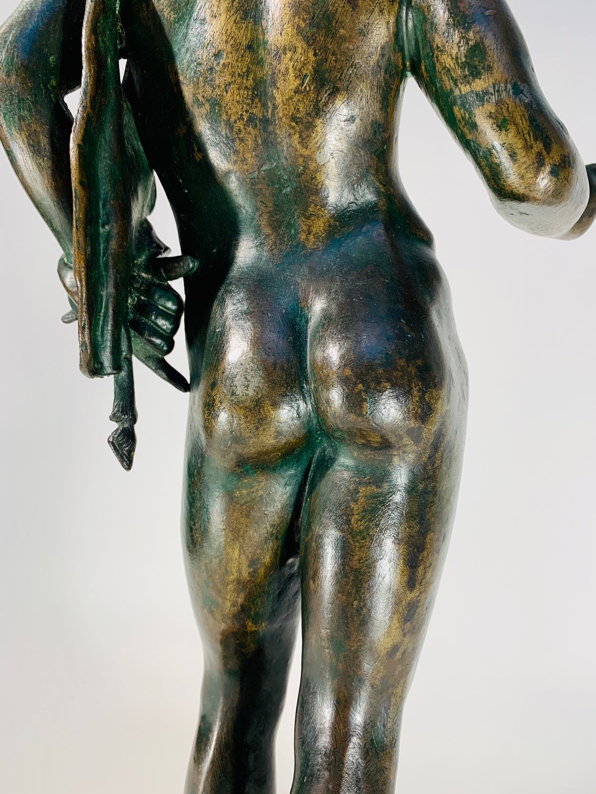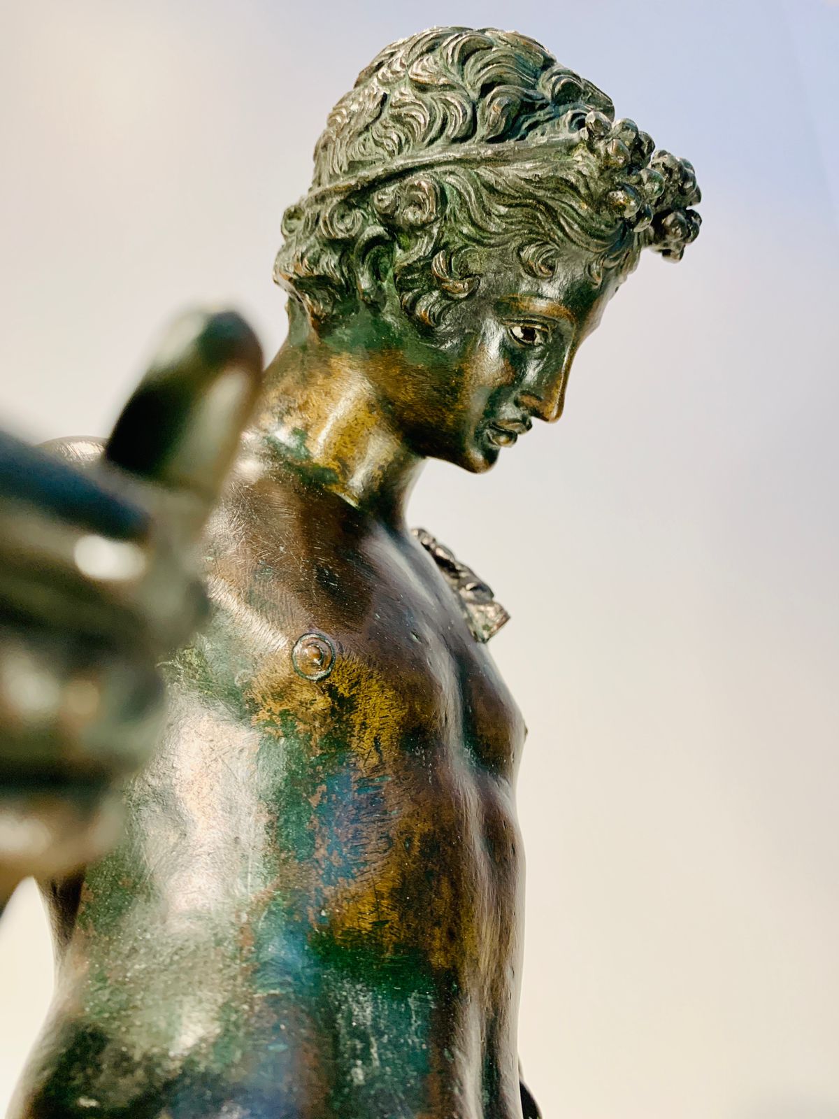 Bronze Romano representando “Narciso” com coroa de louros e pele de animal.
