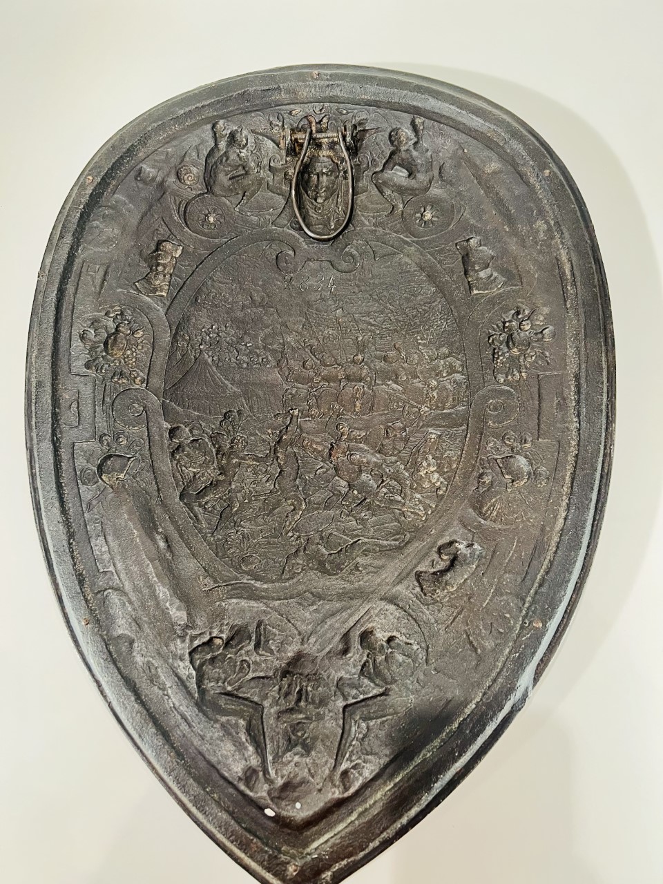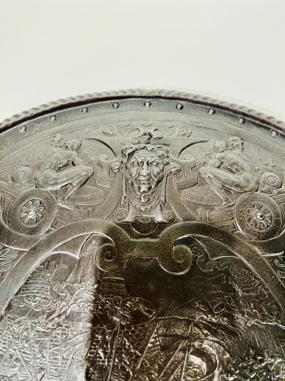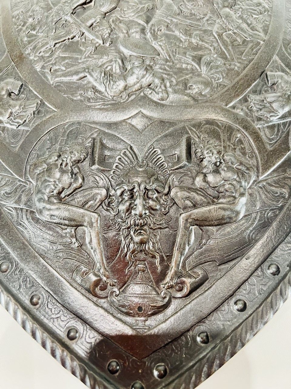 Escudo europeu em bronze com esmerado cinzelamento representando batalha c 1700. Numerado 2834.