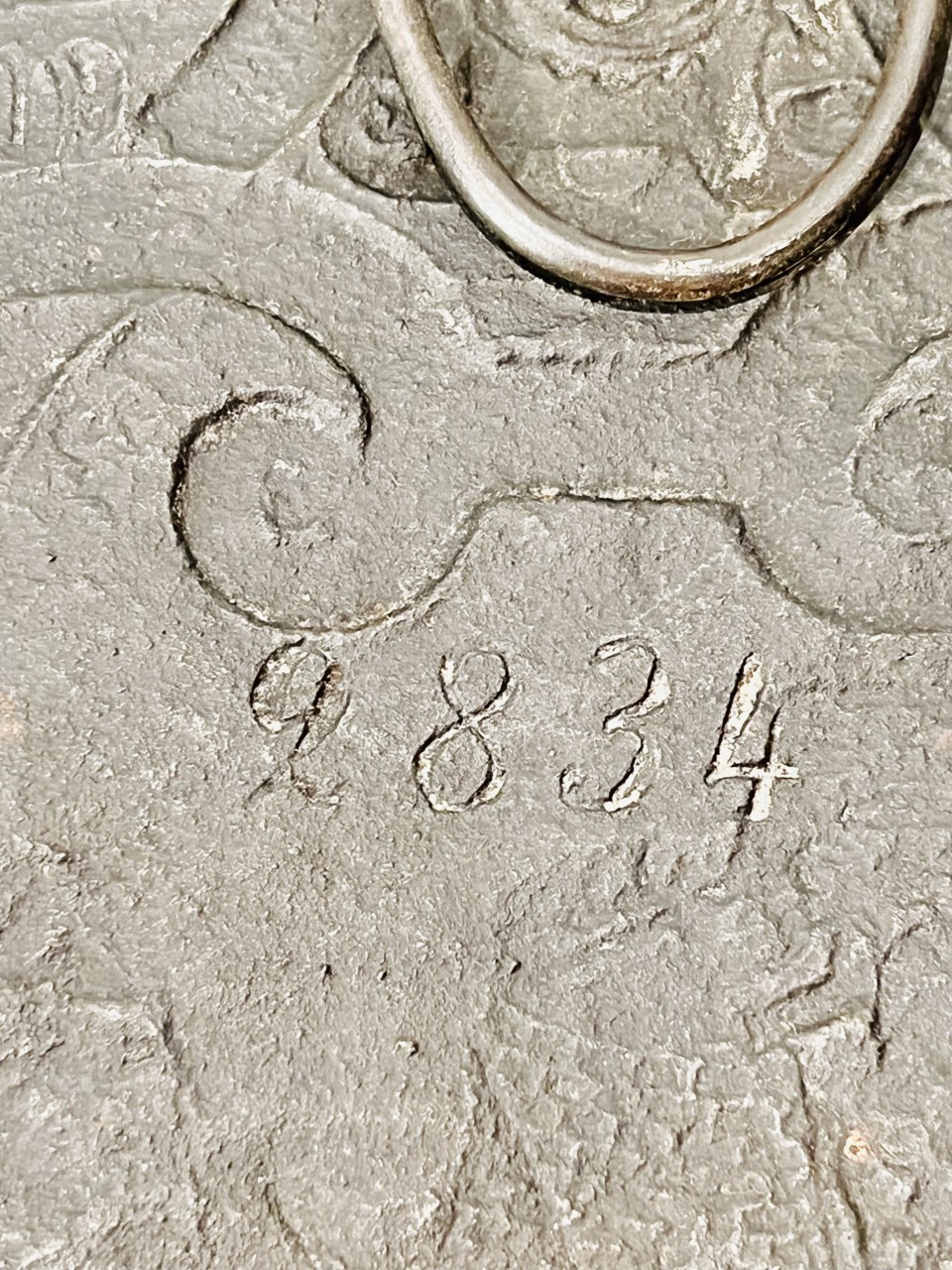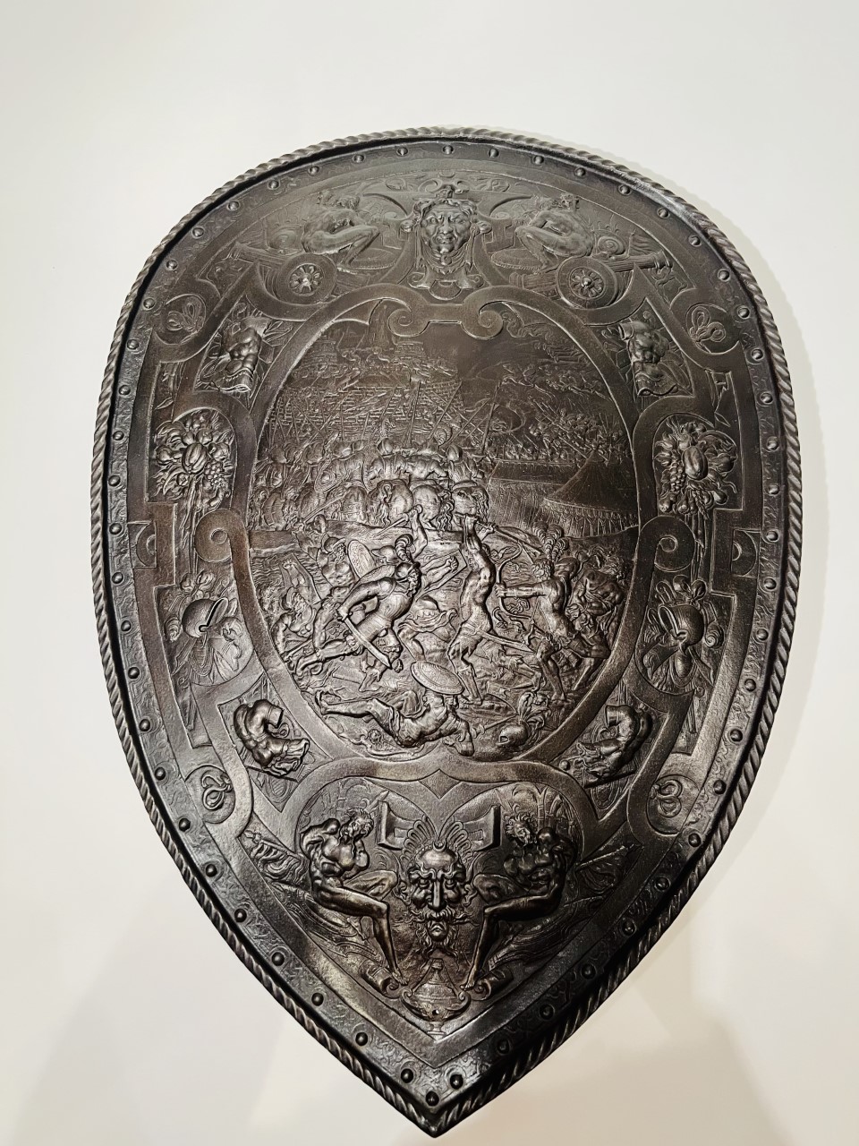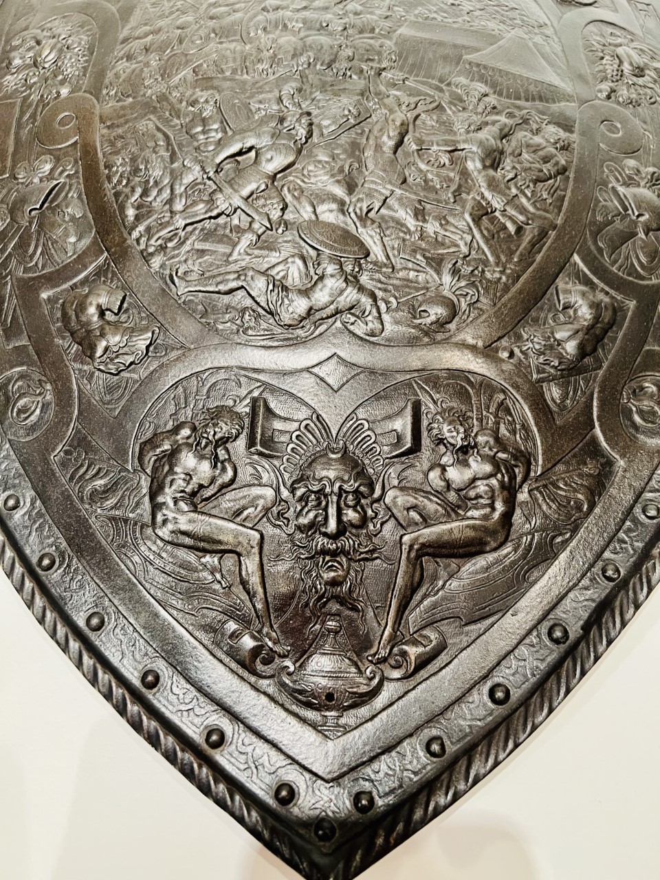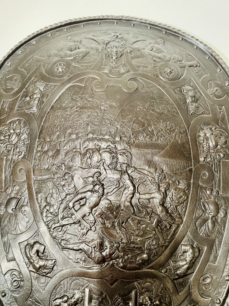 Escudo europeu em bronze com esmerado cinzelamento representando batalha c 1700. Numerado 2834.
