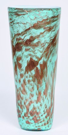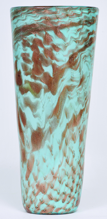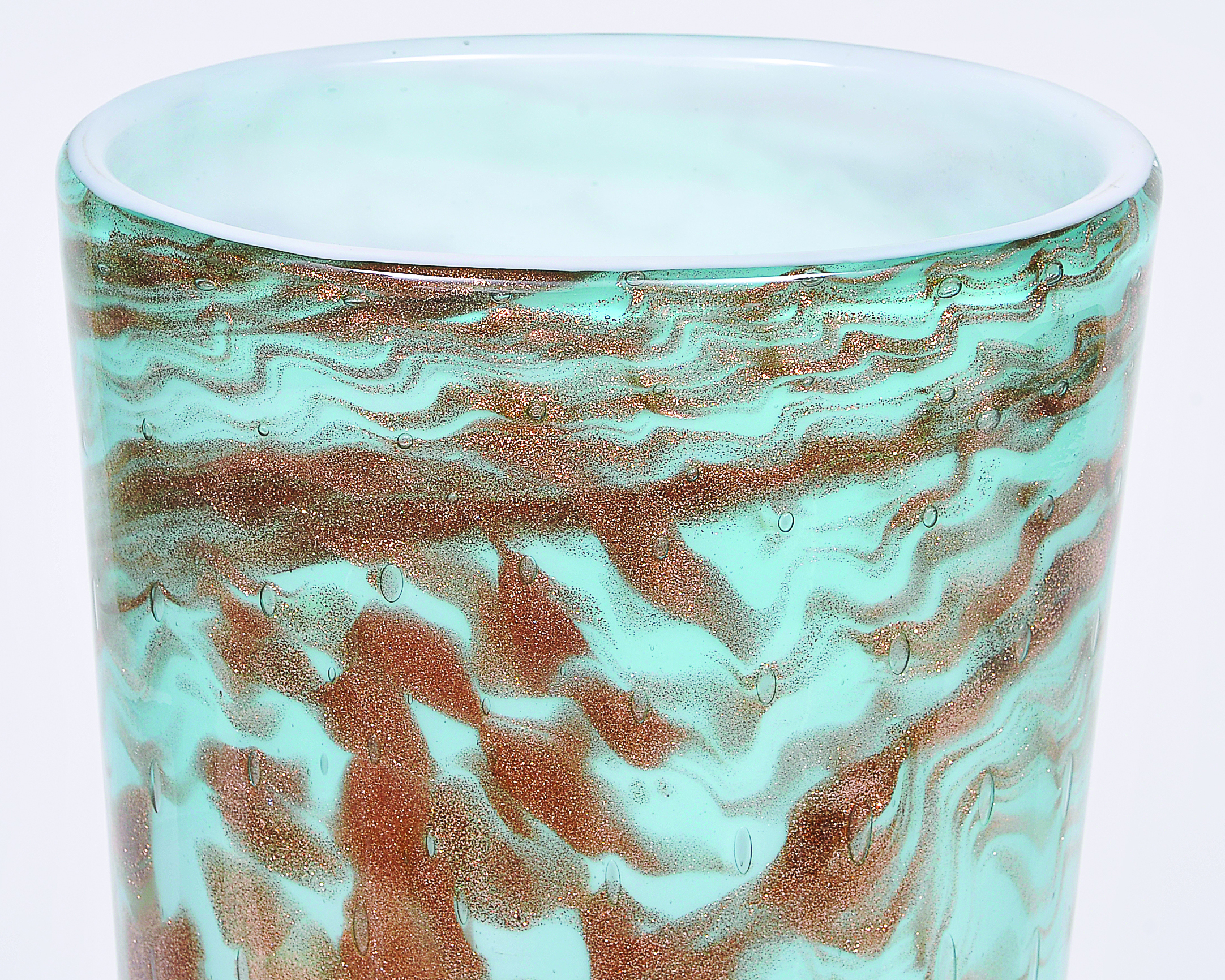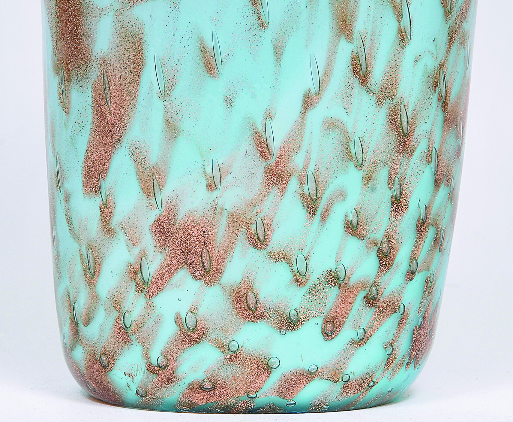 Vaso em vidro artístico soprado de Murano produzido por Aureliano Toso 1950 desenho de DINO MARTENS com “bullicante e venturina” em vidro duplo opaco