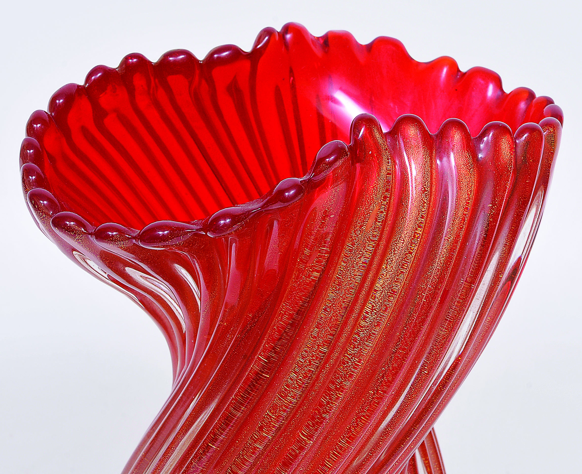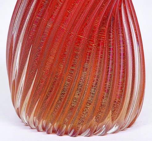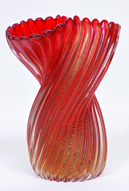 Vaso em vidro artístico soprado de Murano produzido por Archimede Seguso 1950 “Retorto Rubino Oro”
