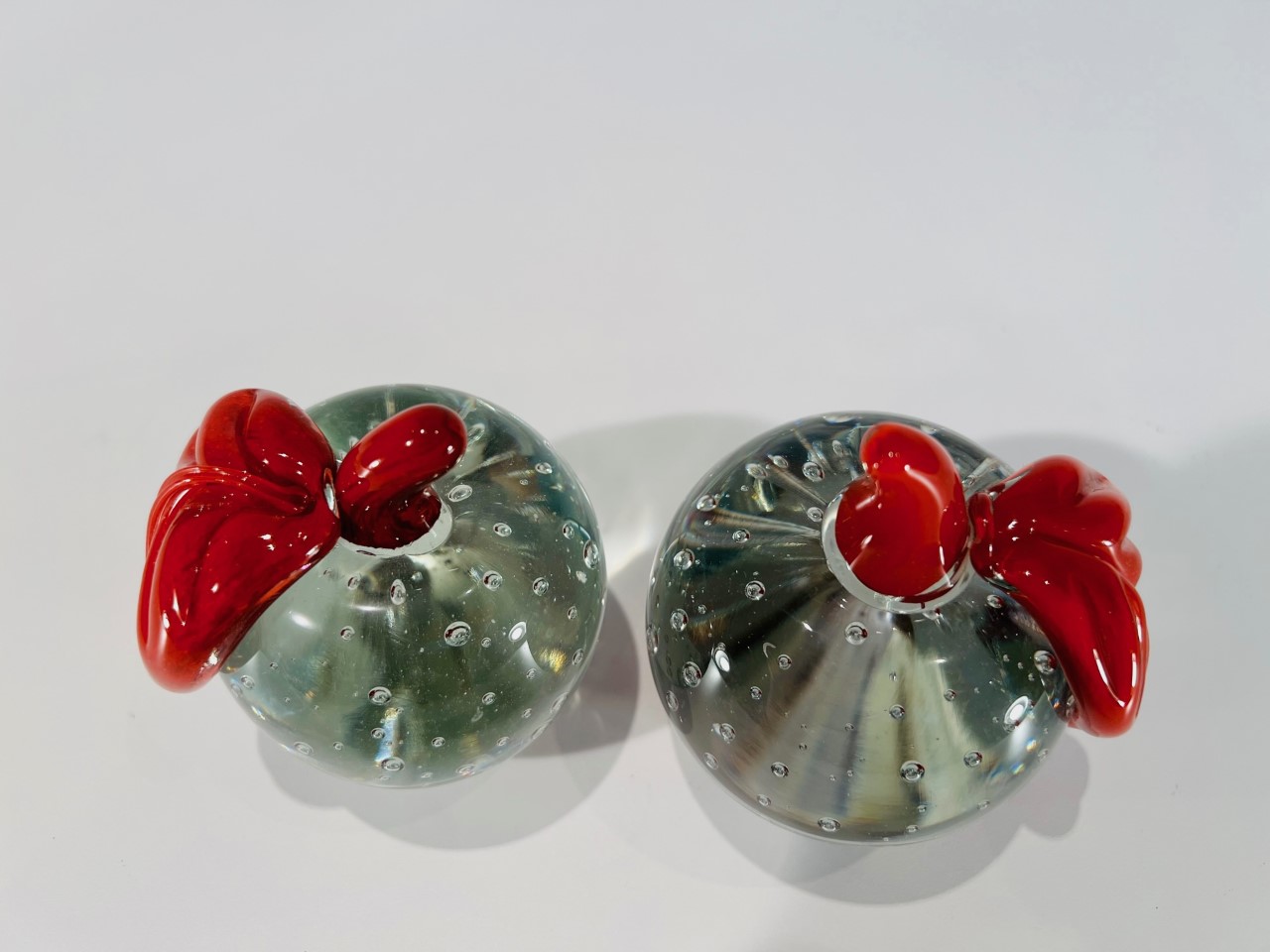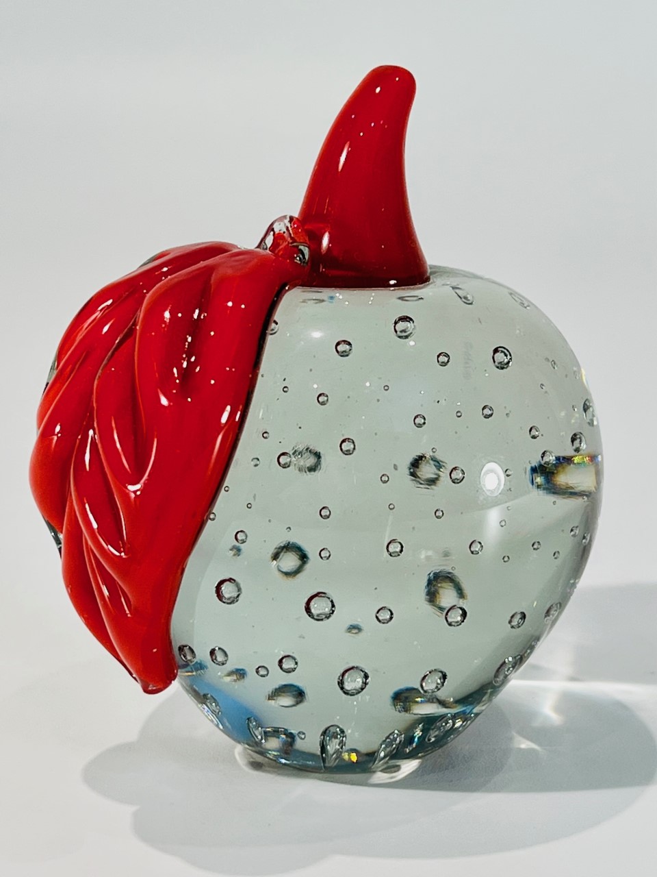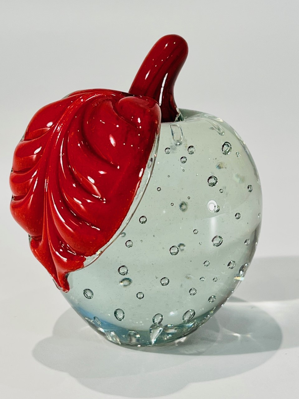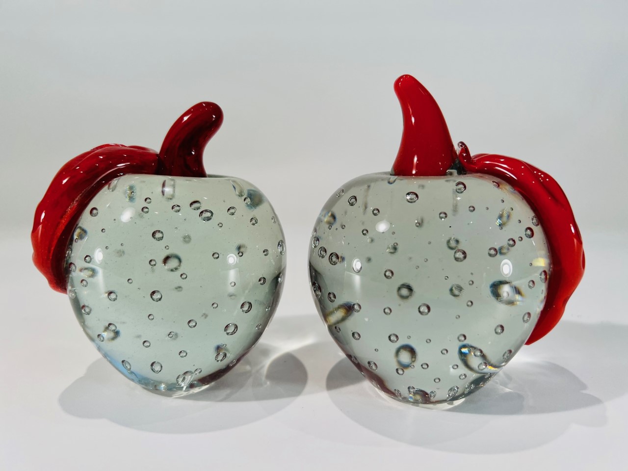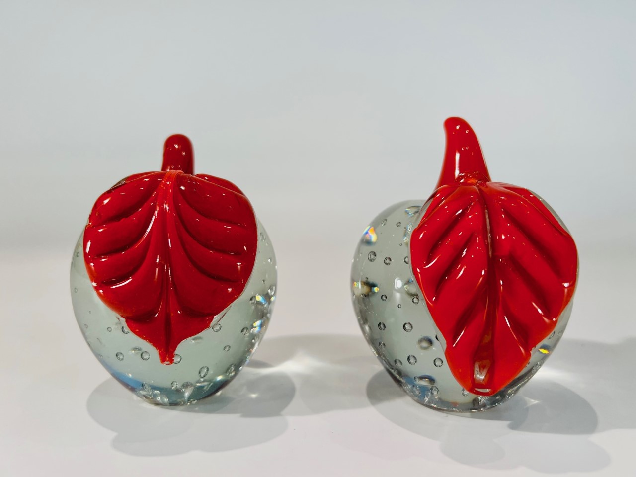 Par de esculturas em vidro artístico soprado, possivelmente, da ilha de Murano representando maçãs com folha aplicada.
