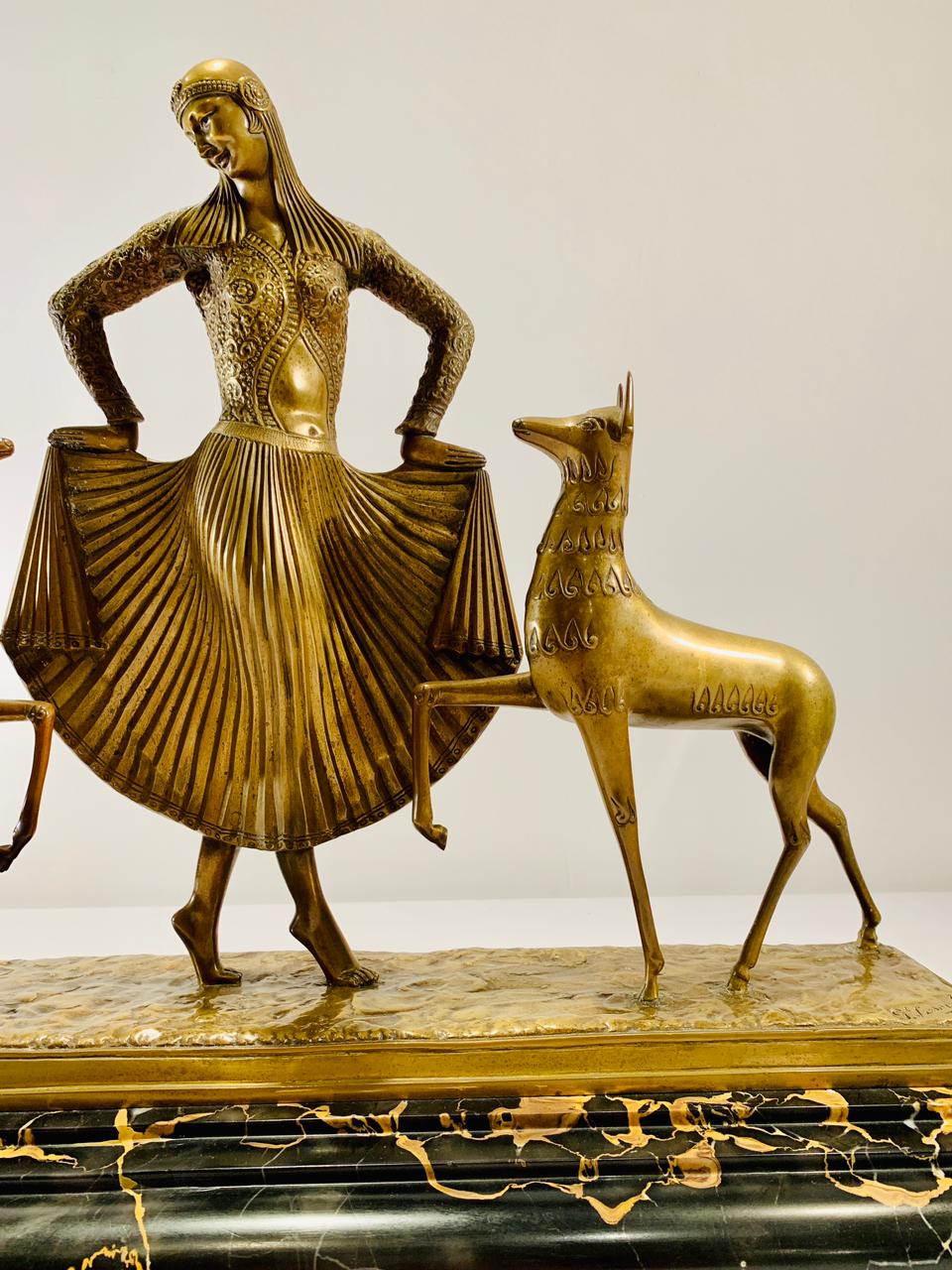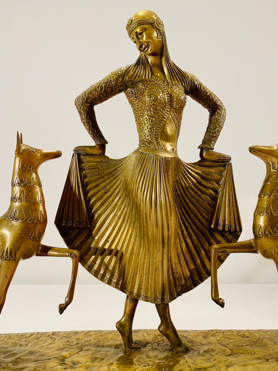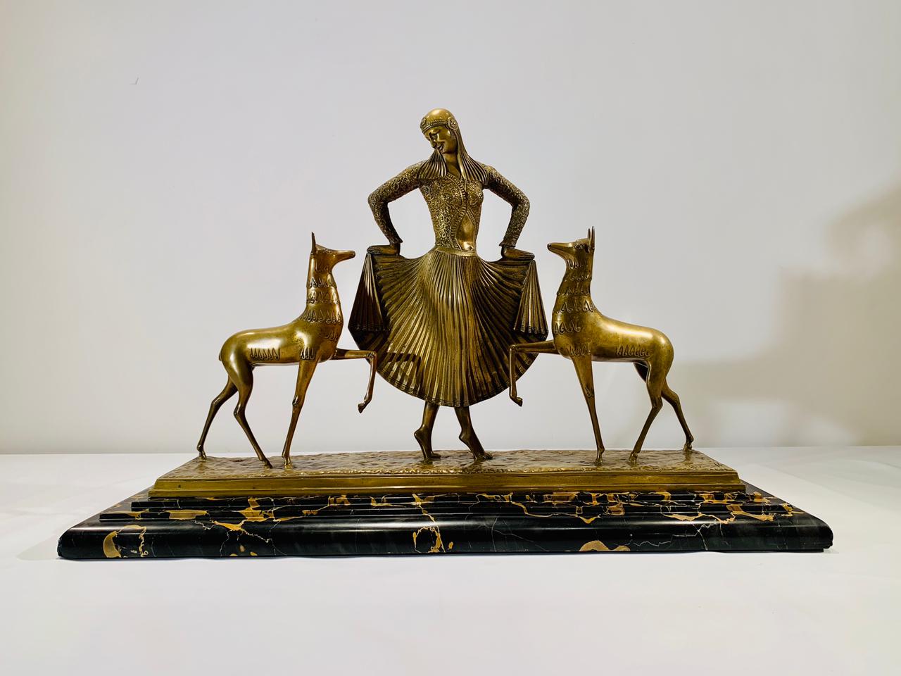 Art Déco 1930. Bronze representando bailarina russa com dois cervos estilizados em base de mármore assinada por GEORGES Lavroff.