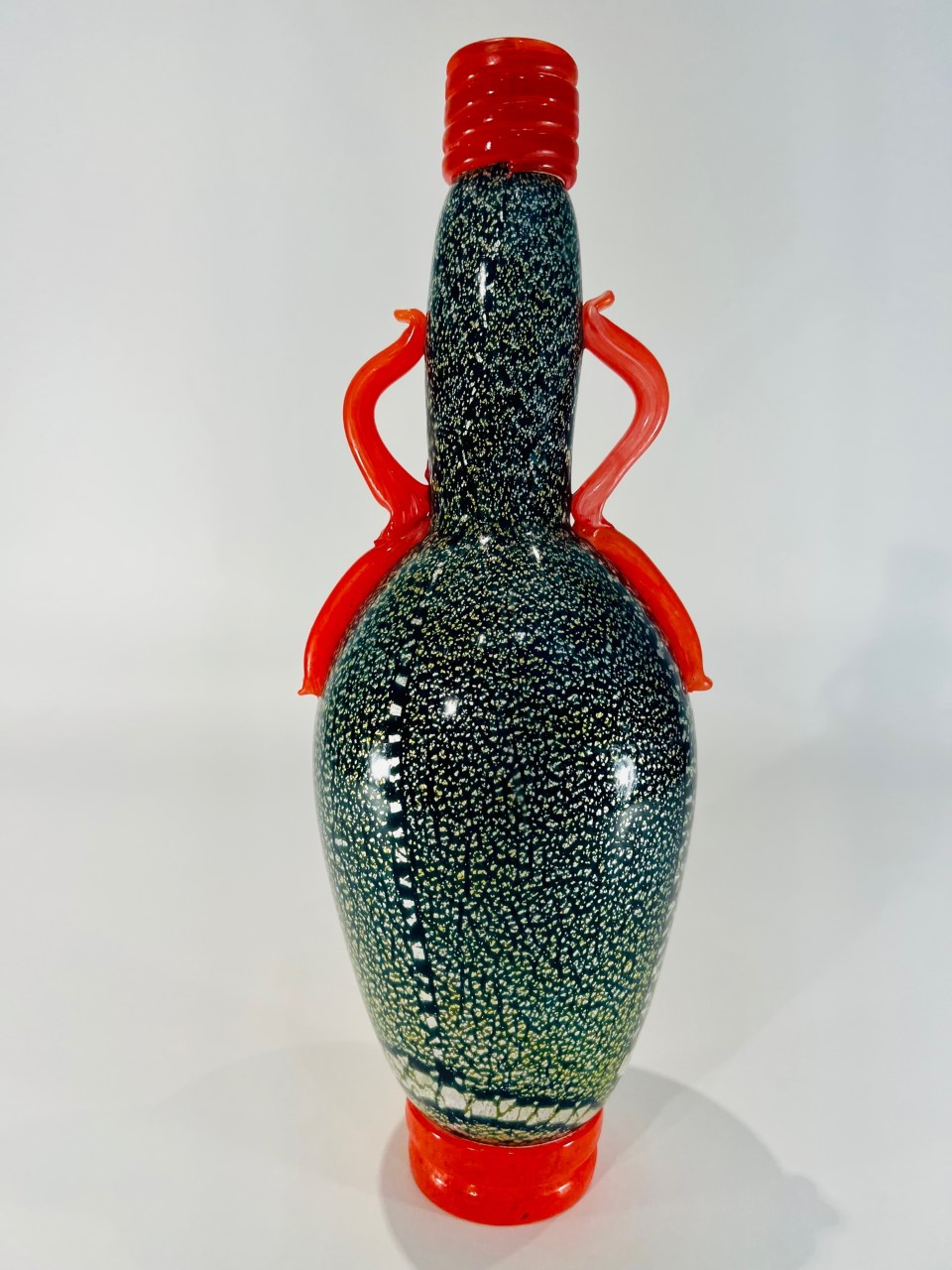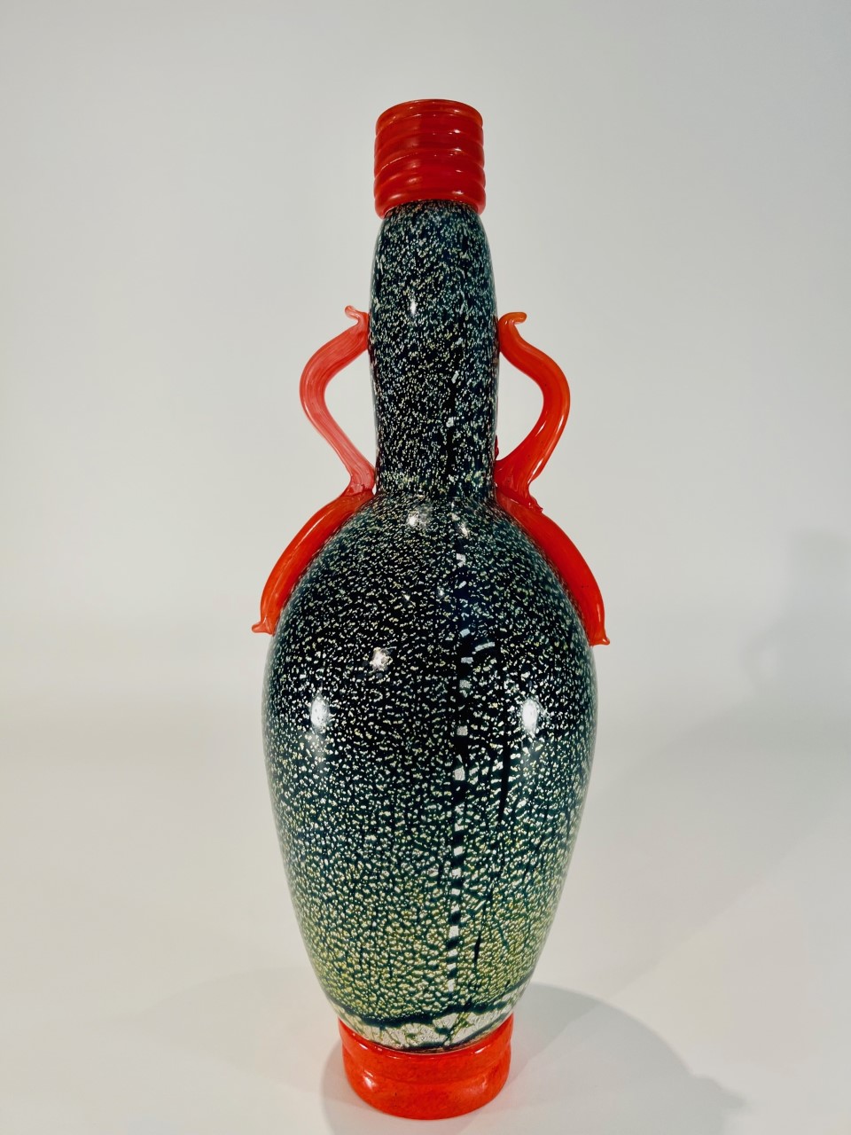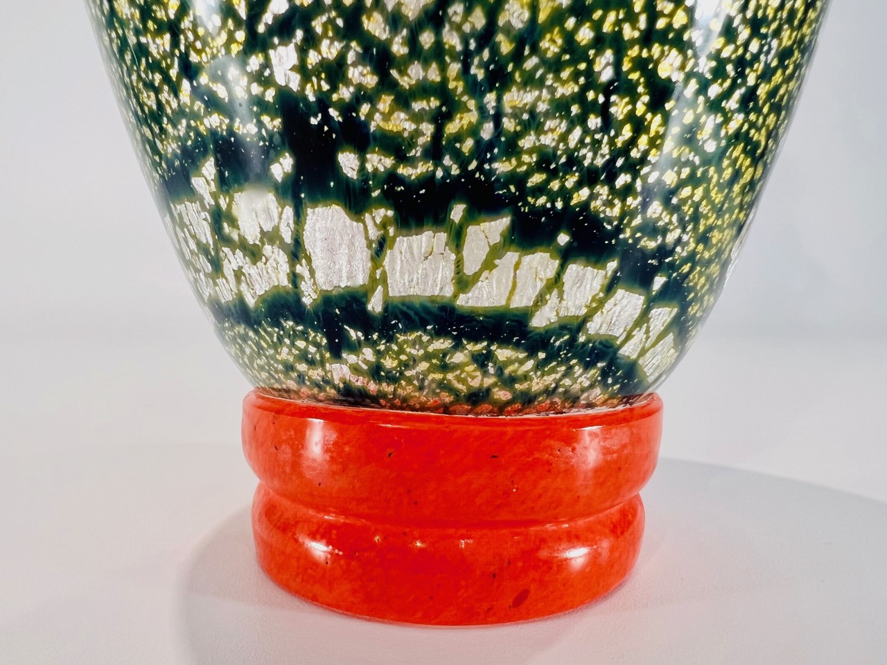 Vaso em vidro artístico soprado de Murano atribuído a Napoleone Martinuzzi com folha de prata e partes aplicadas.