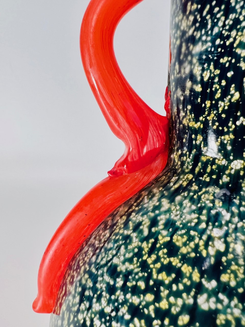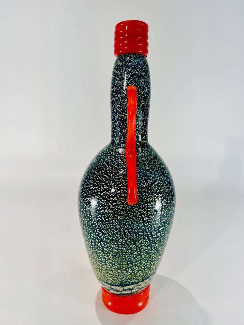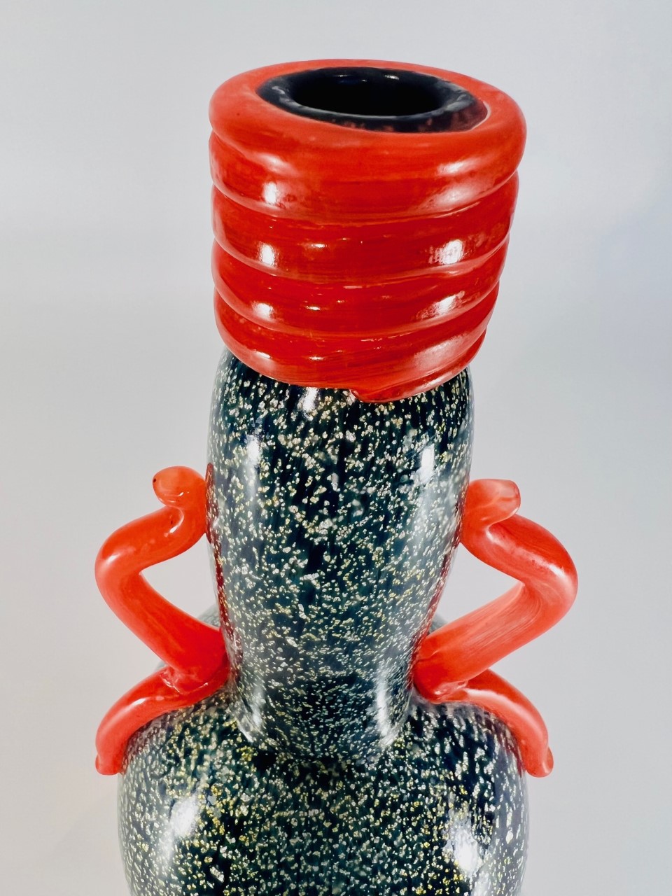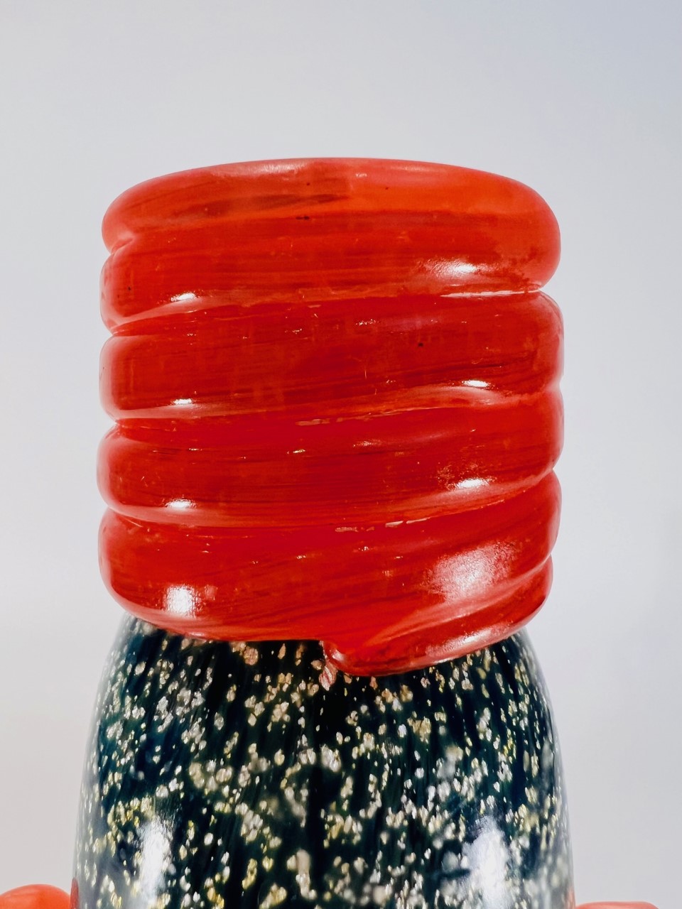 Vaso em vidro artístico soprado de Murano atribuído a Napoleone Martinuzzi com folha de prata e partes aplicadas.