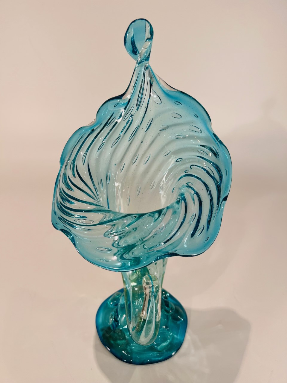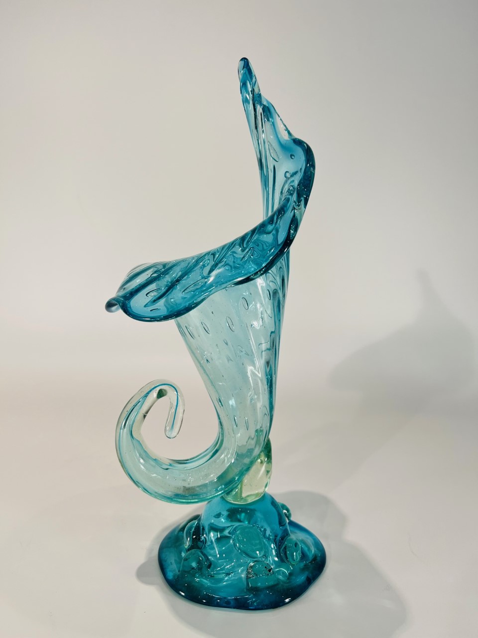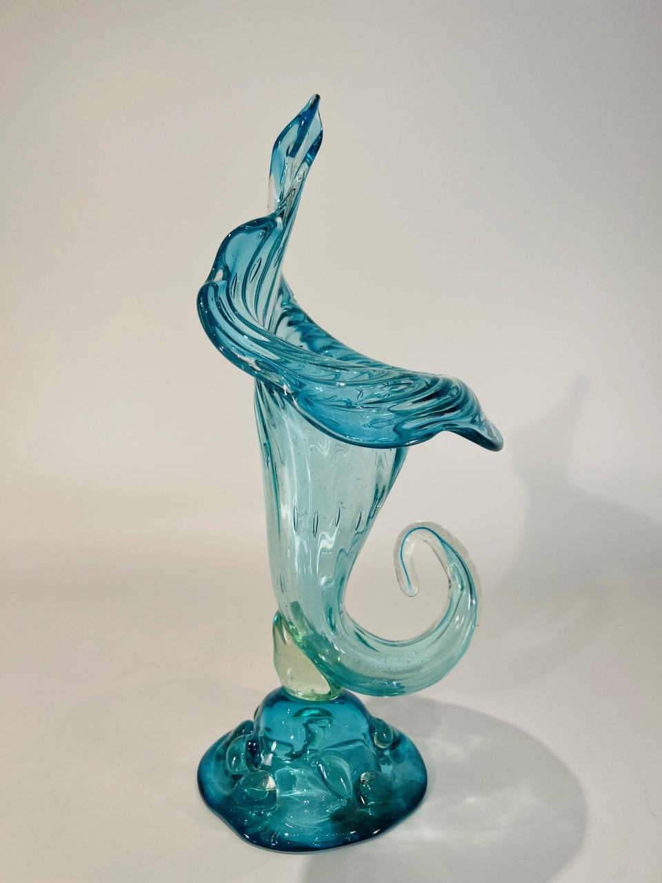 Cornucópia em vidro artístico soprado de Murano em vidro azul transparente aplicado sobre base do mesmo vidro. Circa 1950.