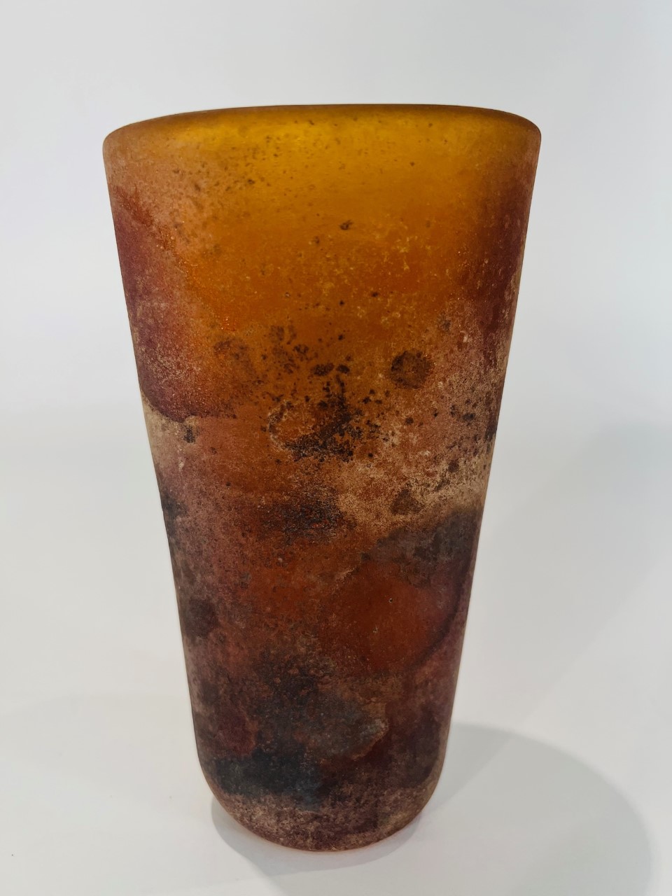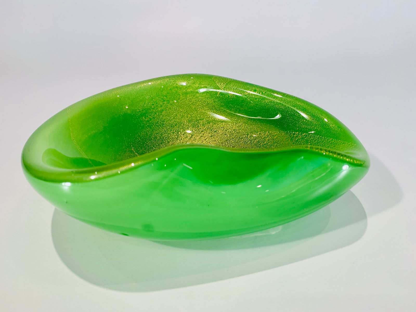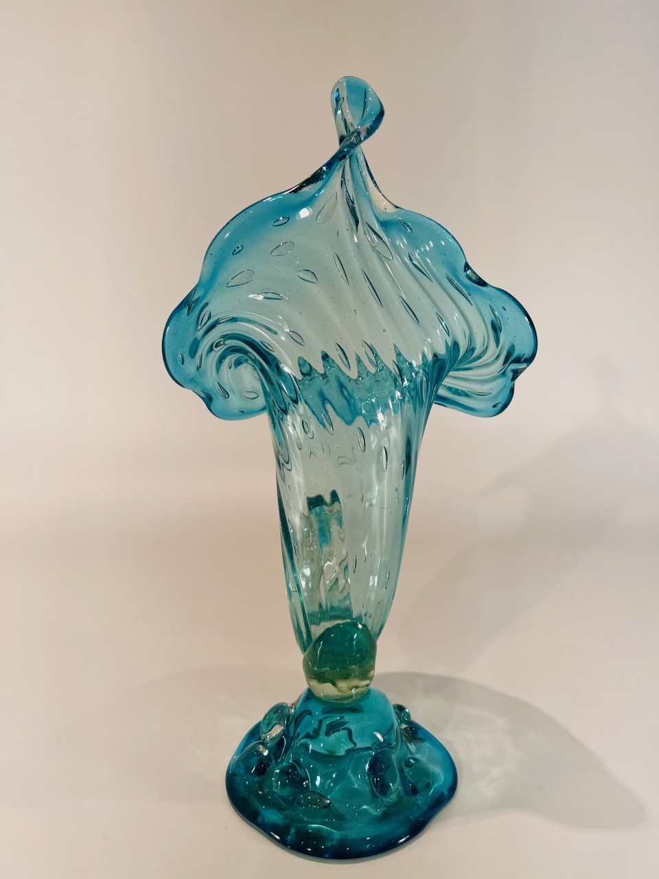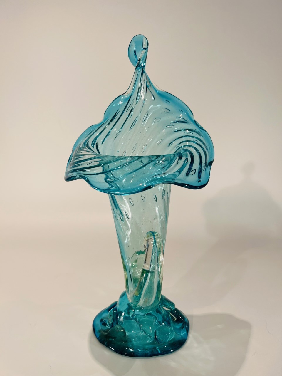 Cornucópia em vidro artístico soprado de Murano em vidro azul transparente aplicado sobre base do mesmo vidro. Circa 1950.