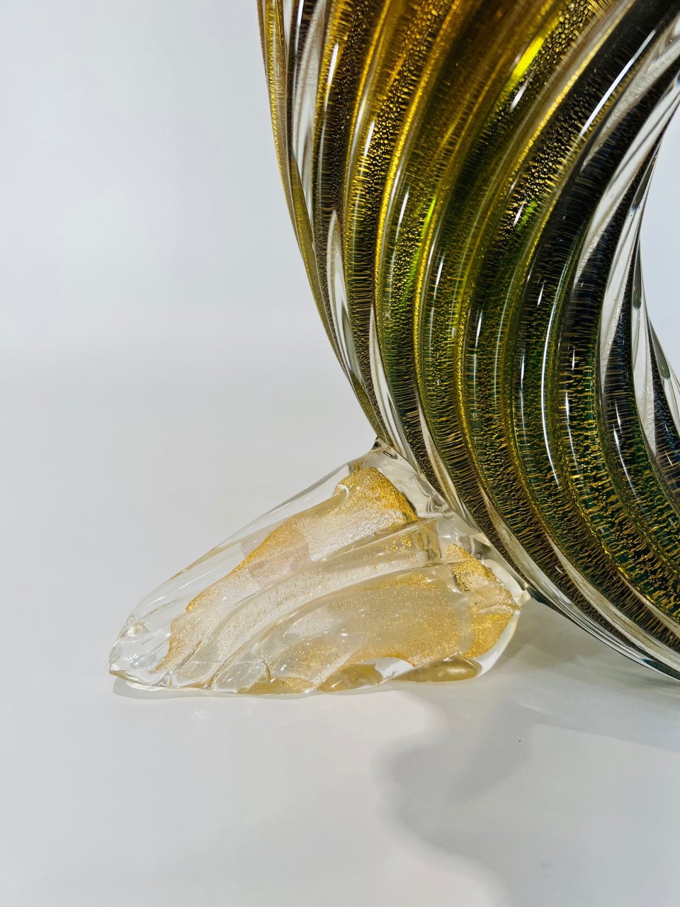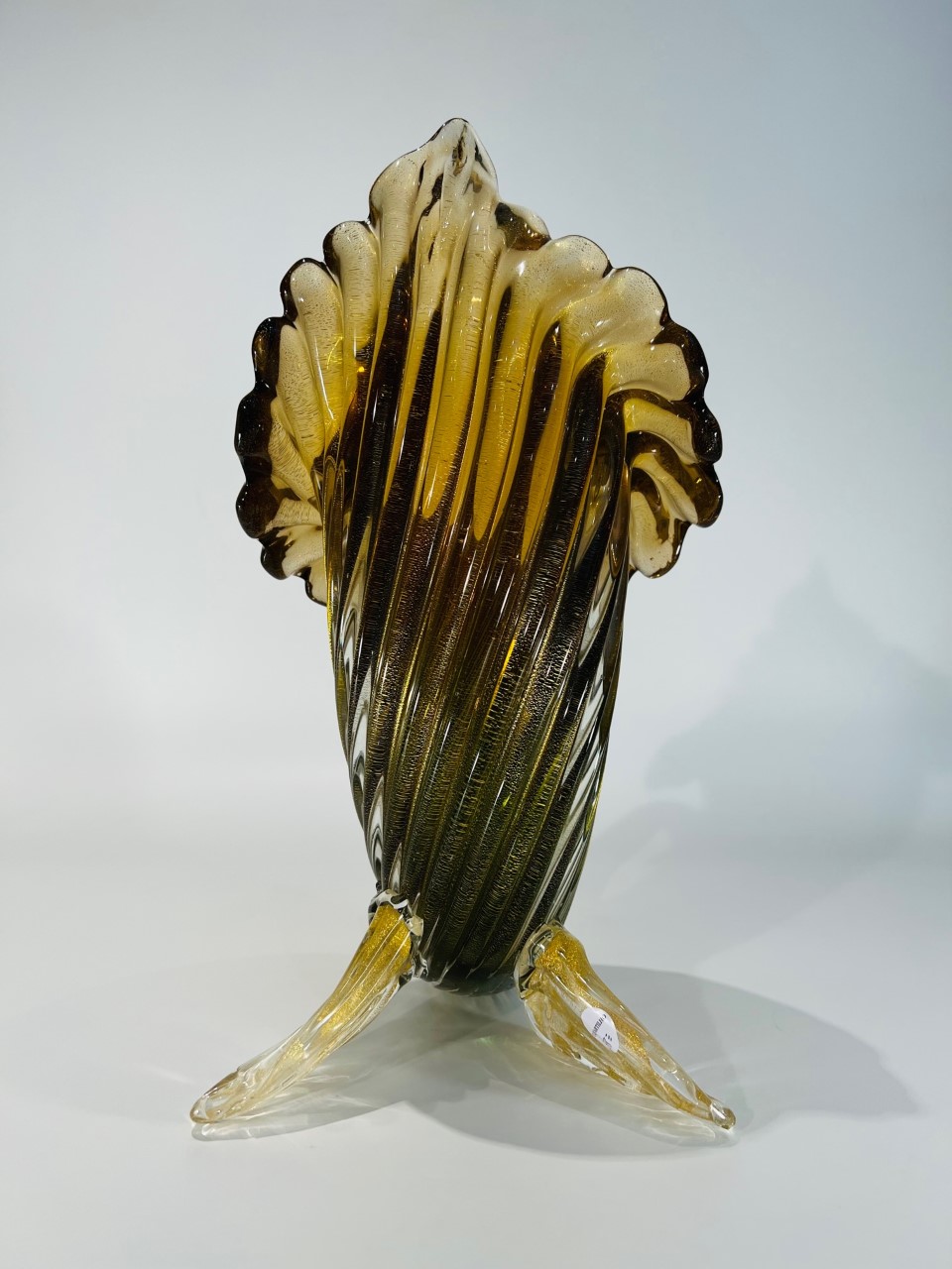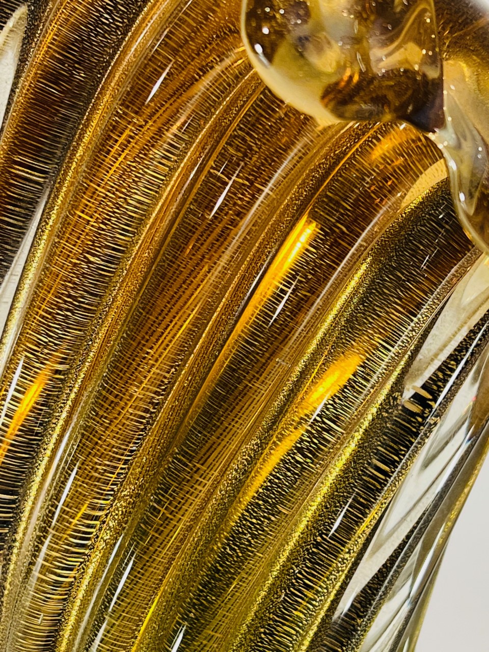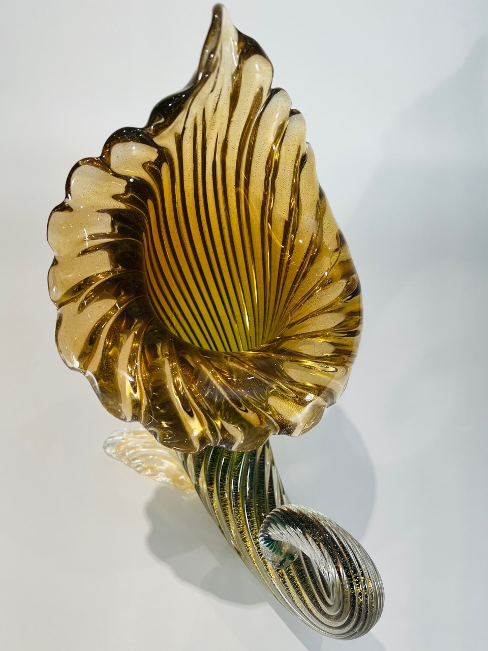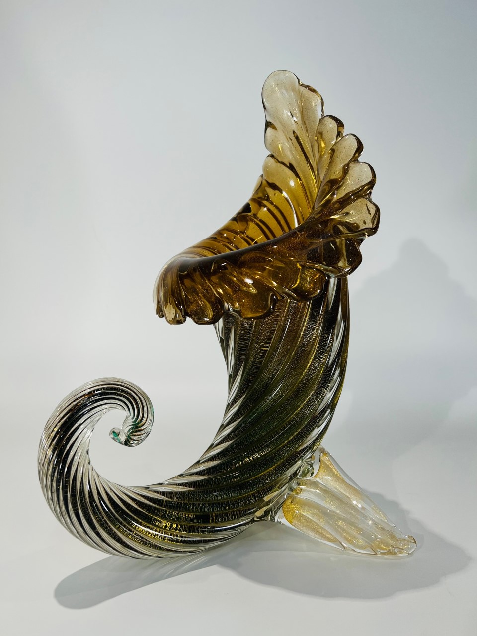 Cornucópia em vidro artístico soprado de Murano produção ARCHIMEDE SEGUSO 1950 “costolato retorto oro” com vidro aplicado.