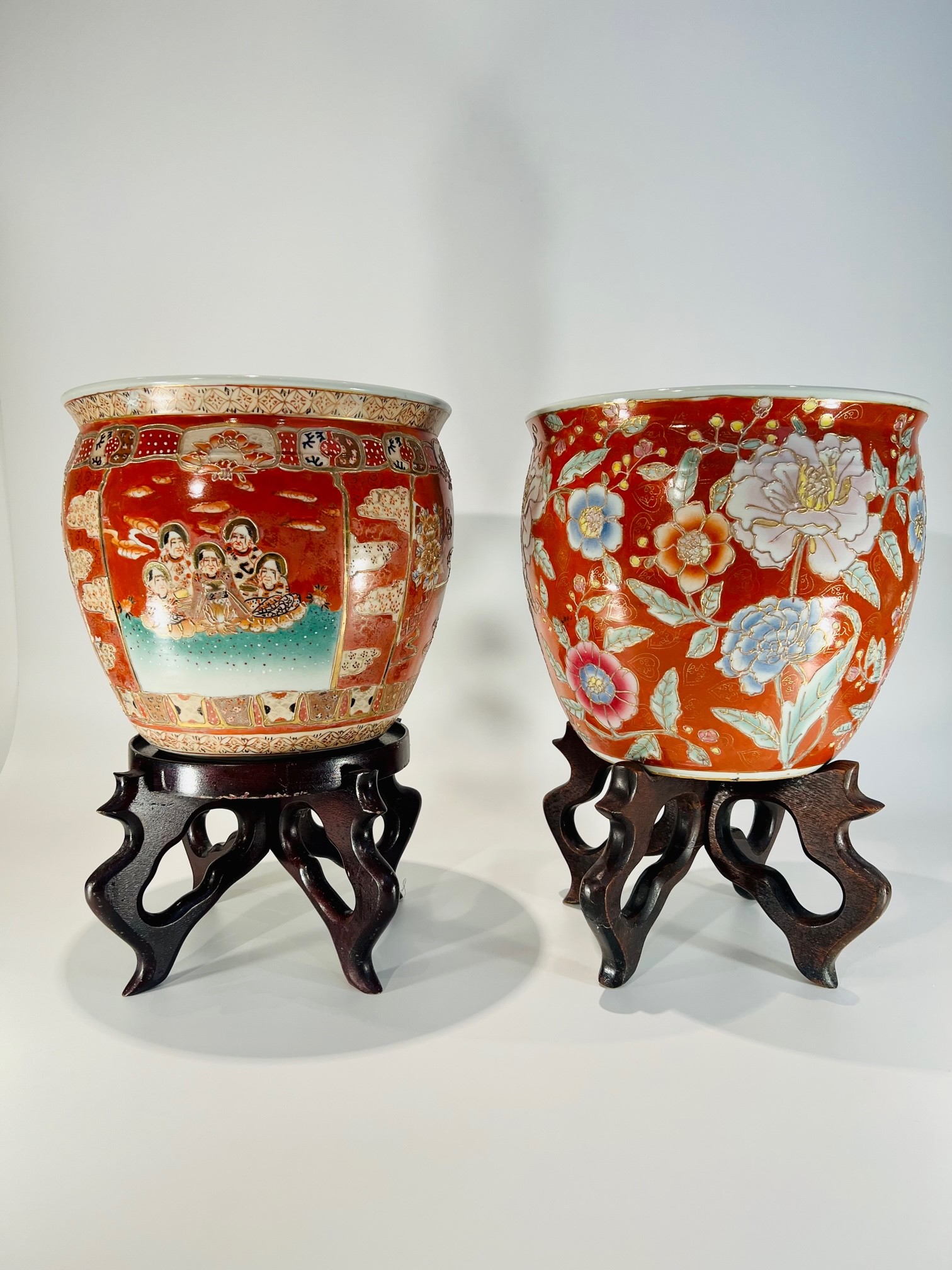 Dois (2) grandes aquários em porcelana japonesa Imari com filete de ouro e pinturas internas sobre base de madeira