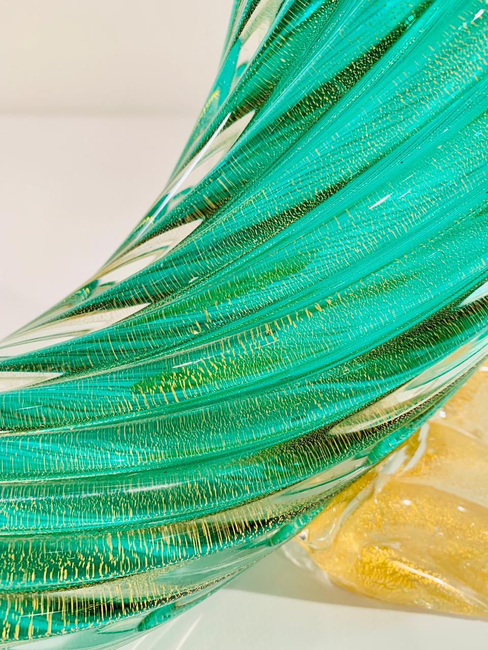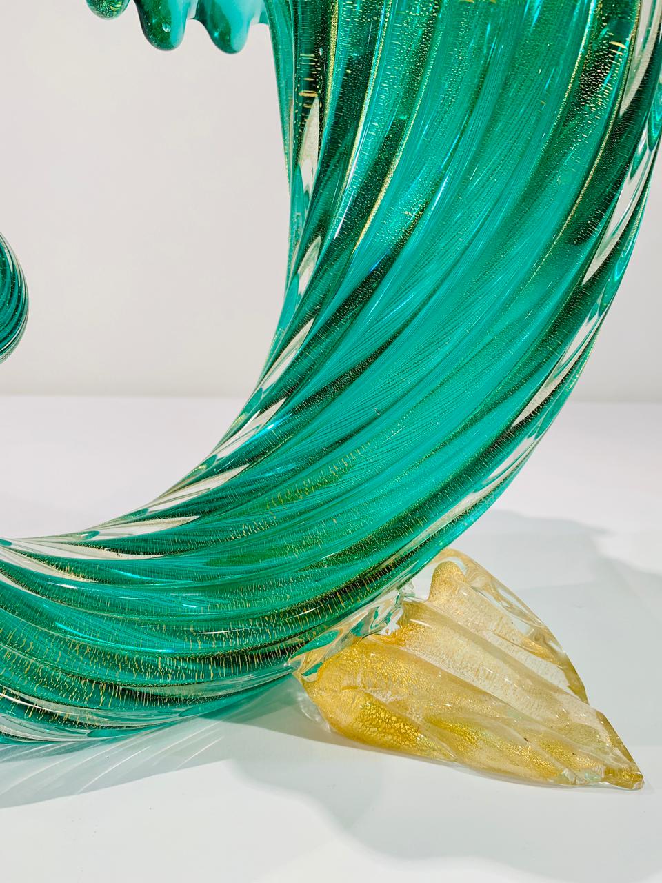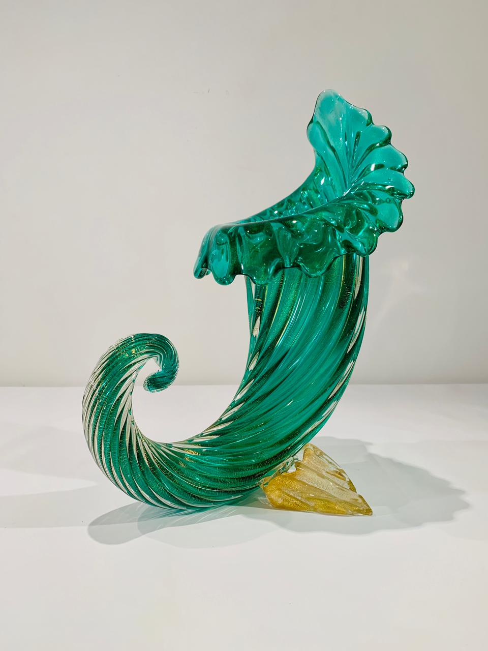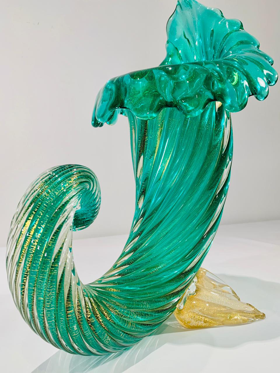Murano Archimede Seguso 1950 representando cornucópia em vidro artístico soprado de Murano com partes aplicadas e folha de ouro na técnica “costolato retorto oro”. Peça única.