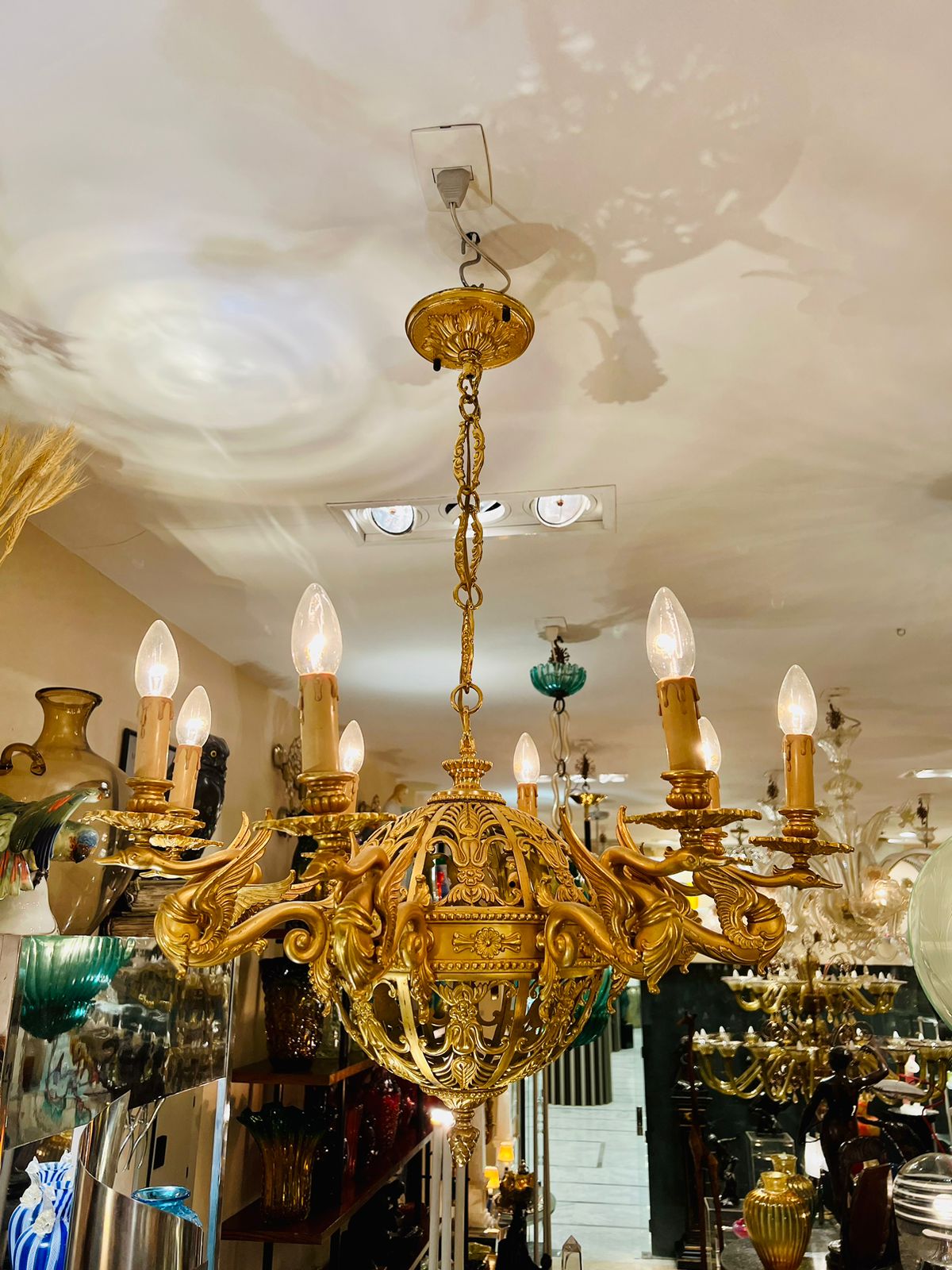 Lustre francês em bronze banhado a ouro estilo Império com Quimeras de cisnes alados para 8 lâmpadas circa 1790