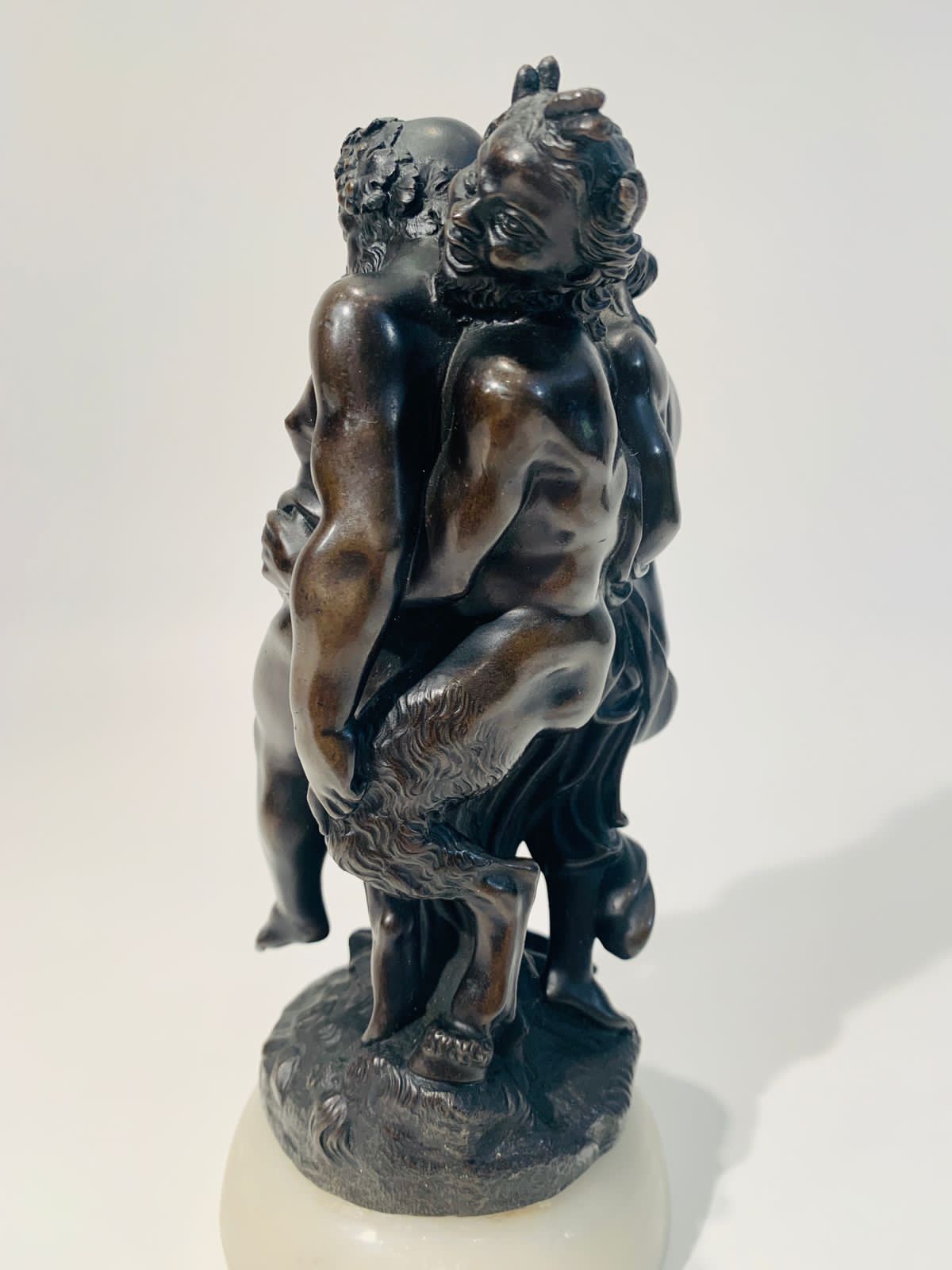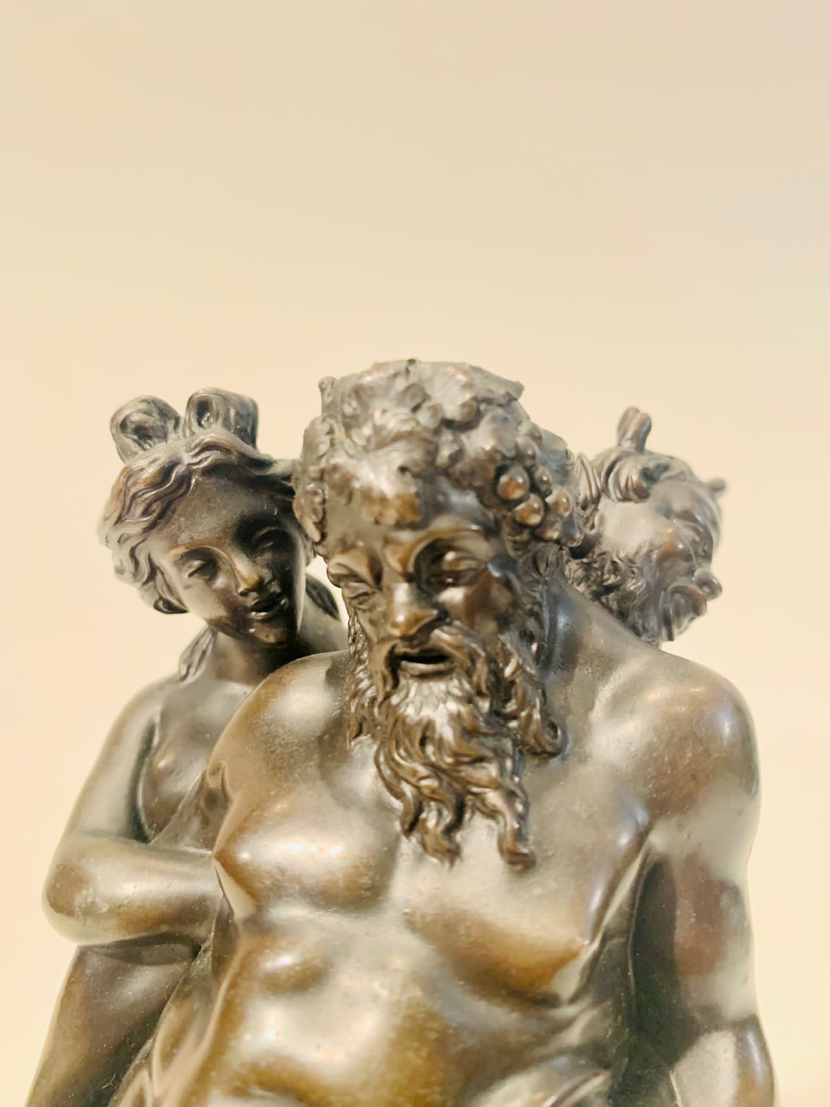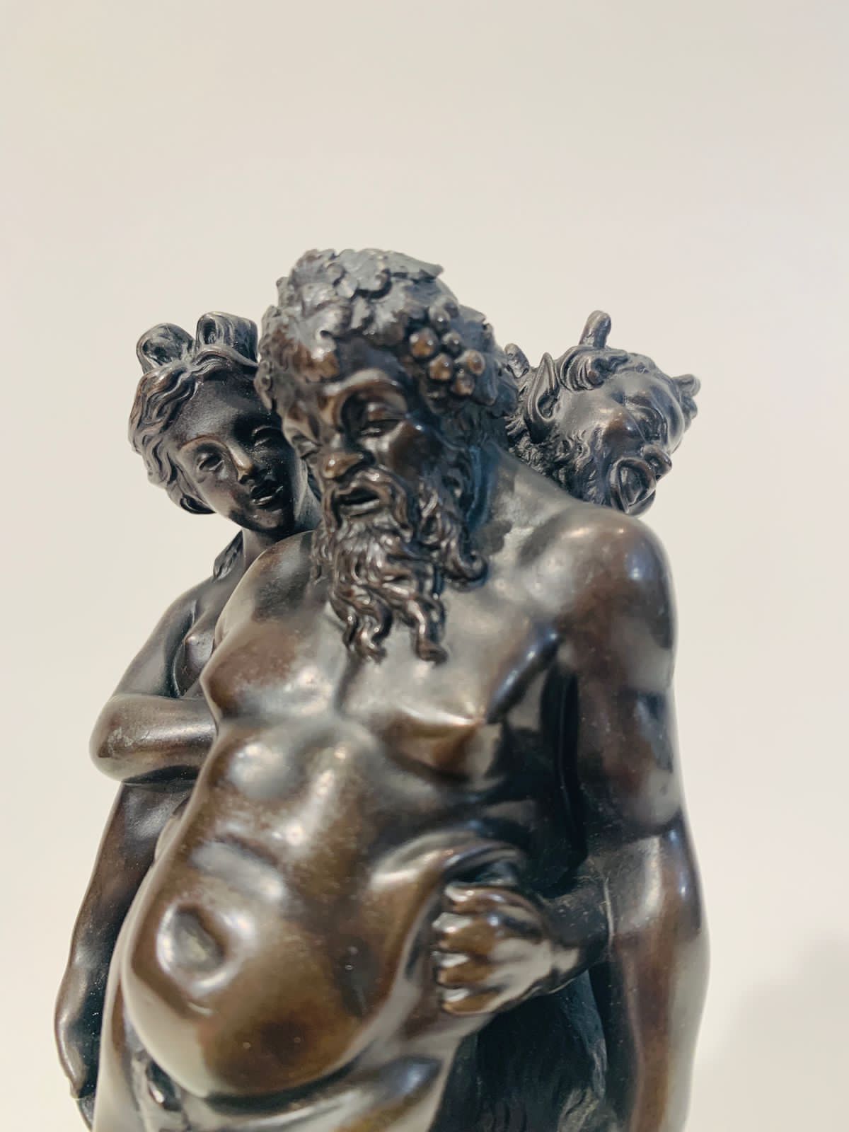 Bronze romano antigo representando ‘Baco’ amparado por ‘Ninfa e Fauno’ com patina medalha e mármore mortuária de base.