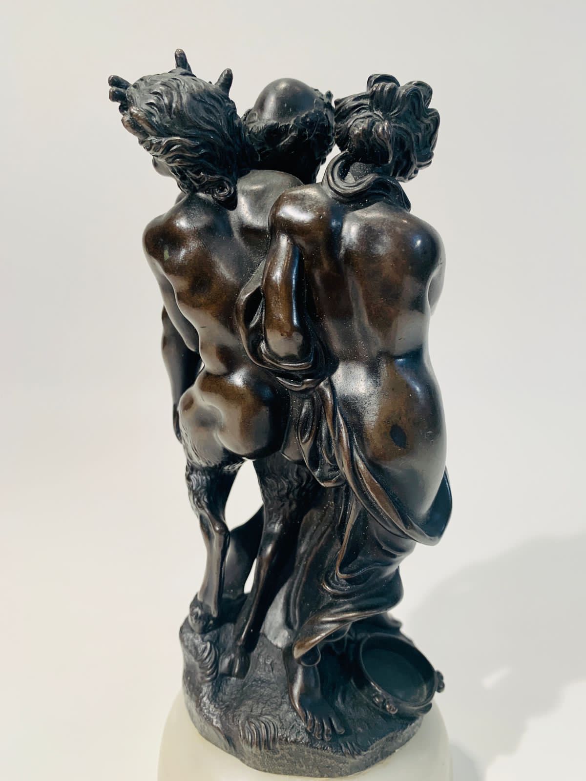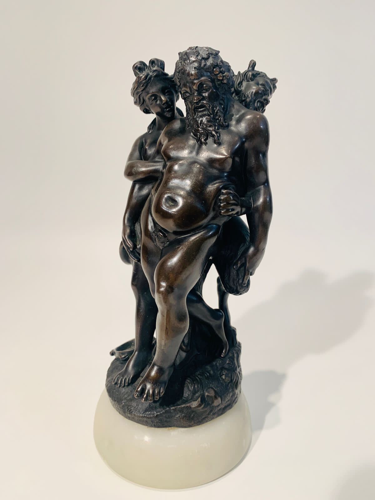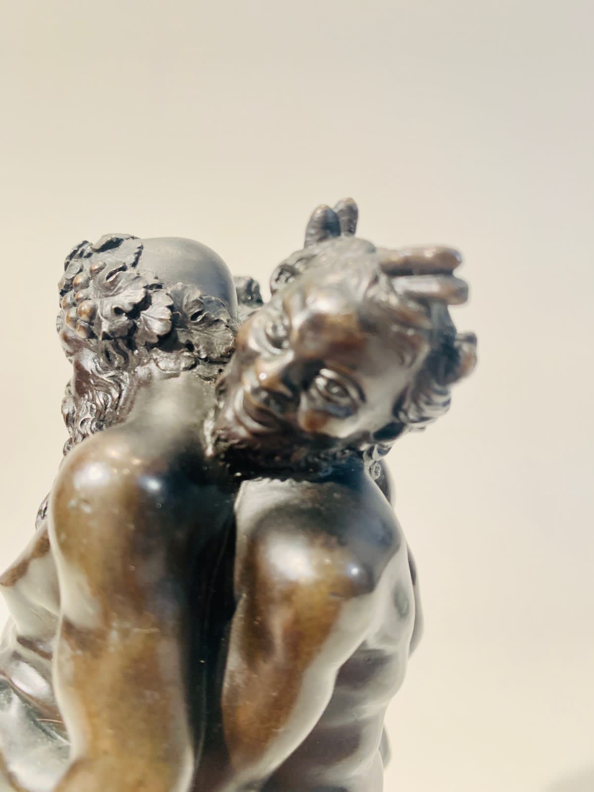 Bronze romano antigo representando ‘Baco’ amparado por ‘Ninfa e Fauno’ com patina medalha e mármore mortuária de base.